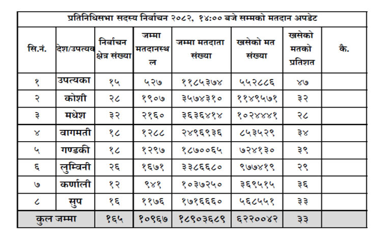 काठमाडौं । आज भइरहेको प्रतिनिधि सभा निर्वाचनमा दिउँसो २ बजेसम्म देशभर ३३ प्रतिशत मतदान भएको छ ।