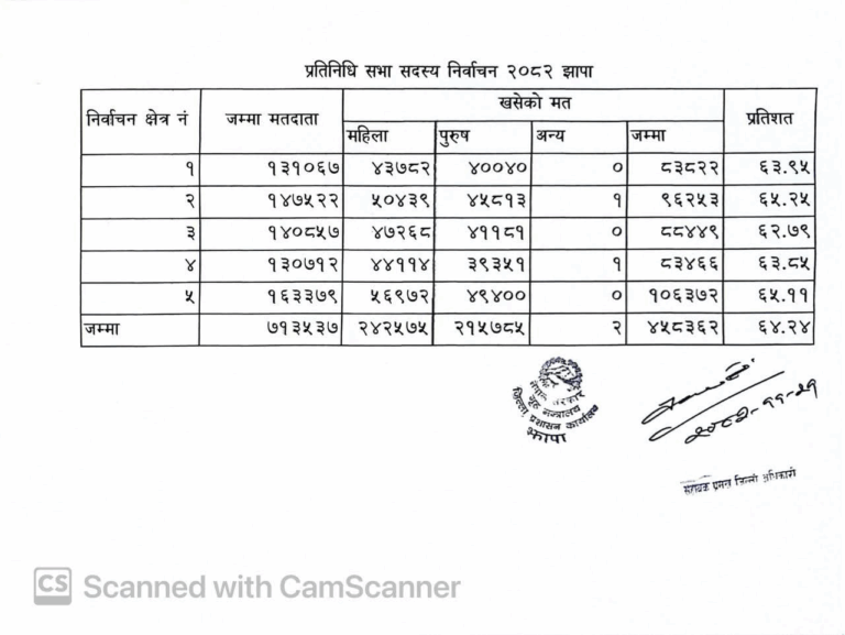 झापा । प्रतिनिधि सभा सदस्य निर्वाचन २०८२ को लागि झापा जिल्लामा करिब ६४ प्रतिशत मत खसेको छ। मुख्य निर्वाचन अधिकृतको कार्यालयले सार्वजनिक गरेको विवरण अनुसार जिल्लाका पाँचवटै निर्वाचन क्षेत्रमा गरी कुल ७ लाख १३ हजार ५३७ मतदातामध्ये ४ लाख ५८ हजार ३६२ मत खसेको हो। यो कुल मतदाताको ६४.२४ प्रतिशत हो।