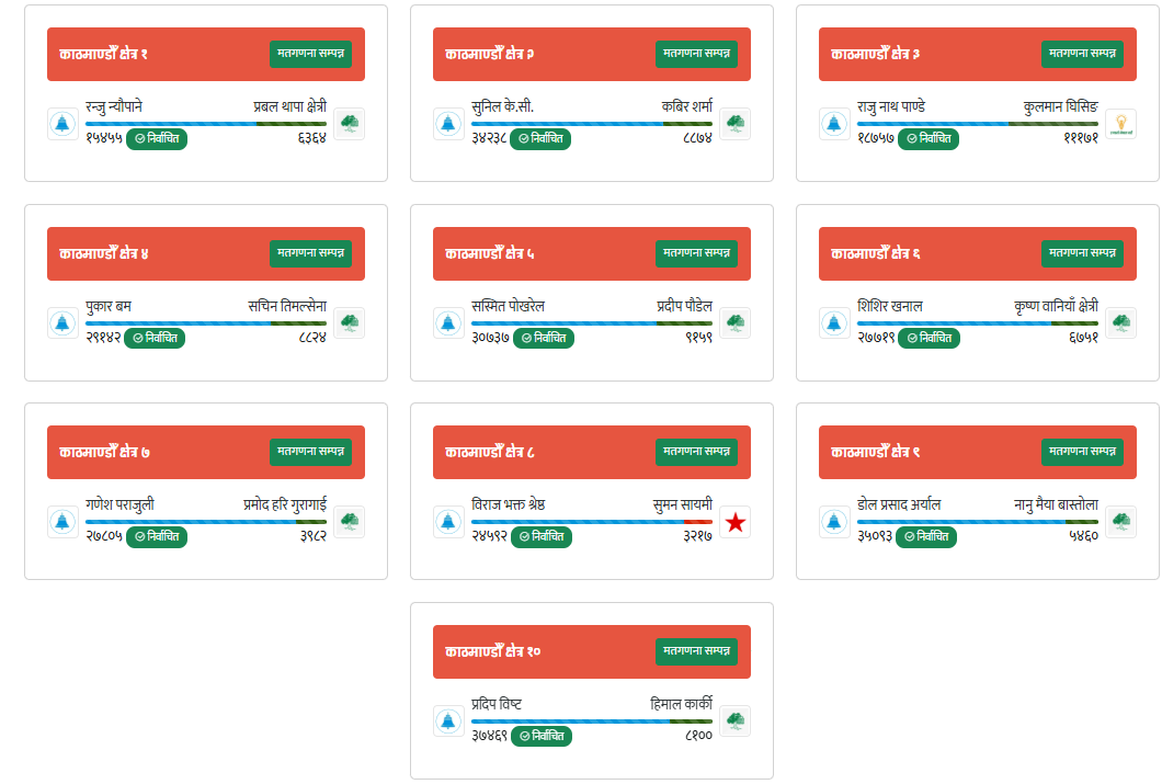 मत गणनाको अन्तिम नतिजा अनुसार काठमाडौंका १० वटै क्षेत्रमा रास्वपाका उम्मेदवारहरू भारी मतान्तरले विजयी भएका छन् ।
