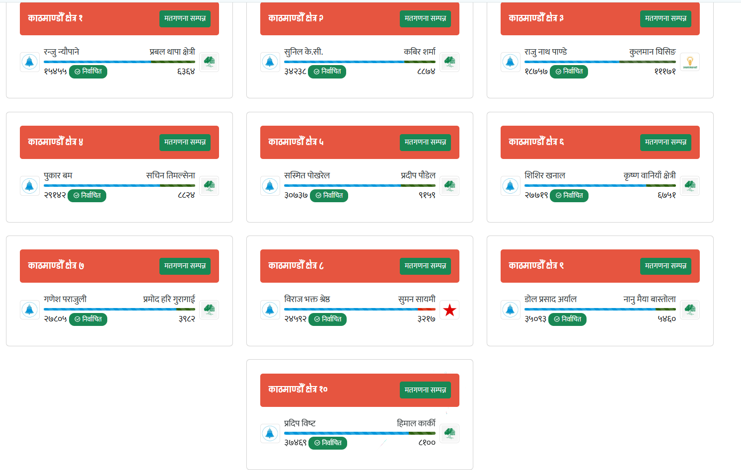 काठमाडौं क्षेत्र नं. ८: विराज भक्त श्रेष्ठ २४,५९२ मतका साथ विजयी भए। उनका निकटतम प्रतिस्पर्धी सुमन सायमीले ३,२१७ मत प्राप्त गरे।