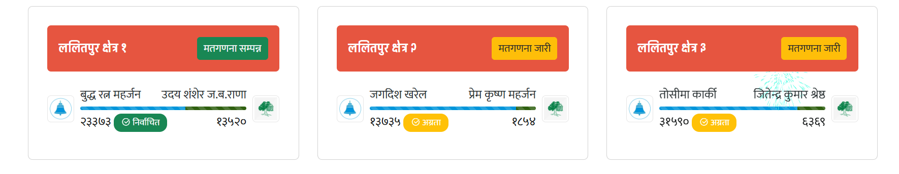 ललितपुर-३: यस क्षेत्रमा तोसीमा कार्की विजयउन्मुख छिन् । उनले ३१ हजार ५९० भोट पाउँदा उनका निकटतम प्रतिद्वन्द्वी कांग्रेसका जितेन्द्र कुमार श्रेष्ठले ६ हजार ३६९ मत पाएका छन् ।