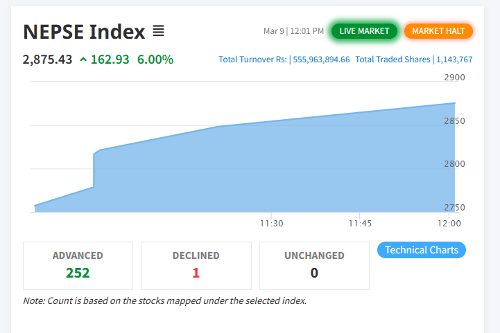 दोस्रो सकारात्मक सर्किट ब्रेक लागेर खुलेको बजारमा फेरि सकारात्मक सर्किट ब्रेक लागेपछि आजका लागि कारोबार बन्द भएको छ । नेप्से १६२.९३ अंकले बढ्दै २८७५.४३ बिन्दुमा उक्लिएको छ ।
