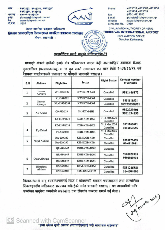 आज मिति २०८२ फागुन २५ गते (मार्च ९, २०२६) का लागि तय गरिएका विभिन्न सातवटा प्रमुख वायुसेवा कम्पनीका उडानहरू पूर्ण रूपमा रद्द गरिएका छन्। प्राधिकरणका अनुसार मध्यपूर्वका प्रमुख ट्रान्जिट र गन्तव्यहरूमा हवाई क्षेत्र बन्द हुँदा उडान व्यवस्थापनमा समस्या देखिएको हो।