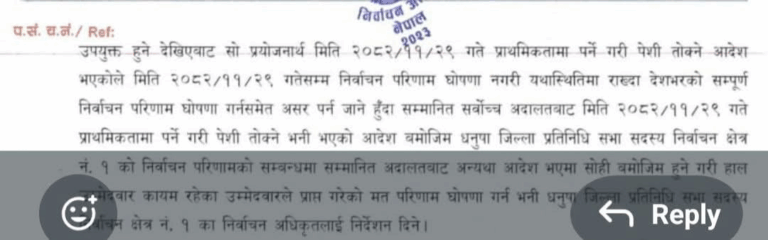 निर्वाचन आयोगले एक विशेष निर्णय गर्दै धनुषा-१ को रोकिएको नतिजा सार्वजनिक गर्न निर्देशन दिएको थियो । सर्वोच्च अदालतले आजैका लागि पेशी तोकेको भए पनि देशभरको निर्वाचन परिणाम घोषणामा असर पर्ने देखिएपछि आयोगले यस्तो बाटो रोजेको हो ।