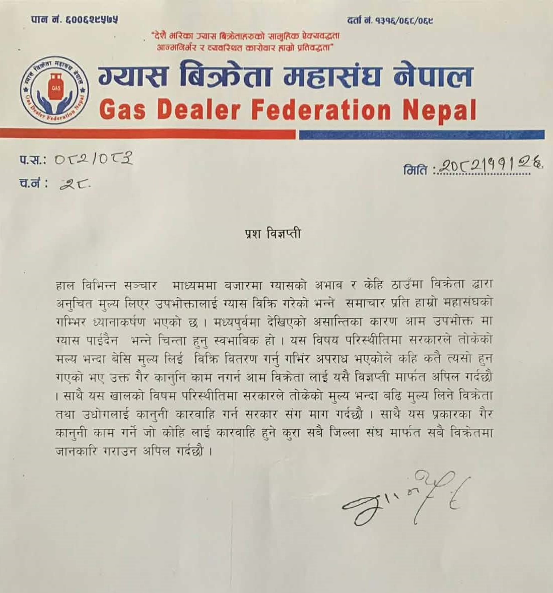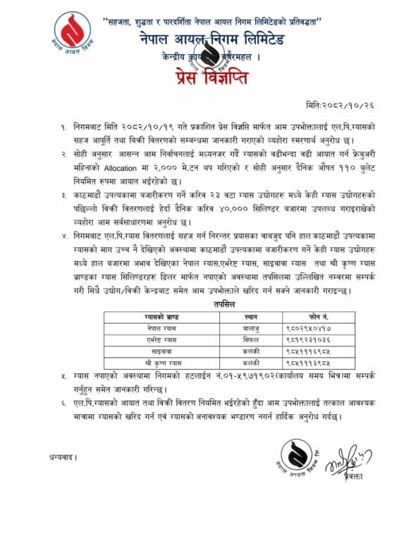 जसअनुसार बजारमा ग्यास अभाव रहेको गुनासो व्यापक रुपमा आइरहेकाले सम्पूर्ण उद्योगहरुले आधिकारिक विक्रेतामार्फत मात्रै ग्यासको बिक्री वितरणको व्यवस्था मिलाएर विक्रेतालाई जारी गरेको बिलमा उल्लेख भएको सिलिण्डर संख्याअनुसारको बिक्री भए नभएको यकिन गरी रेकर्ड भिडाएर निगमलाई जानकारी गराउने, विक्रेताले बिक्री गर्ने ग्यास अनिवार्य रुपमा घरायसी प्रयोजनमा उपभोग गर्ने ग्राहकलाई पहिलो प्राथमिकतामा राखेर बिक्री वितरणको व्यवस्था मिलाउन तथा ग्यास बिक्री गरेको उपभोक्ताको नाम र मोबाइल नम्बरको रेकर्ड अनिवार्य रुपमा राख्नुपर्ने निर्देशन निगमले दिएको छ ।