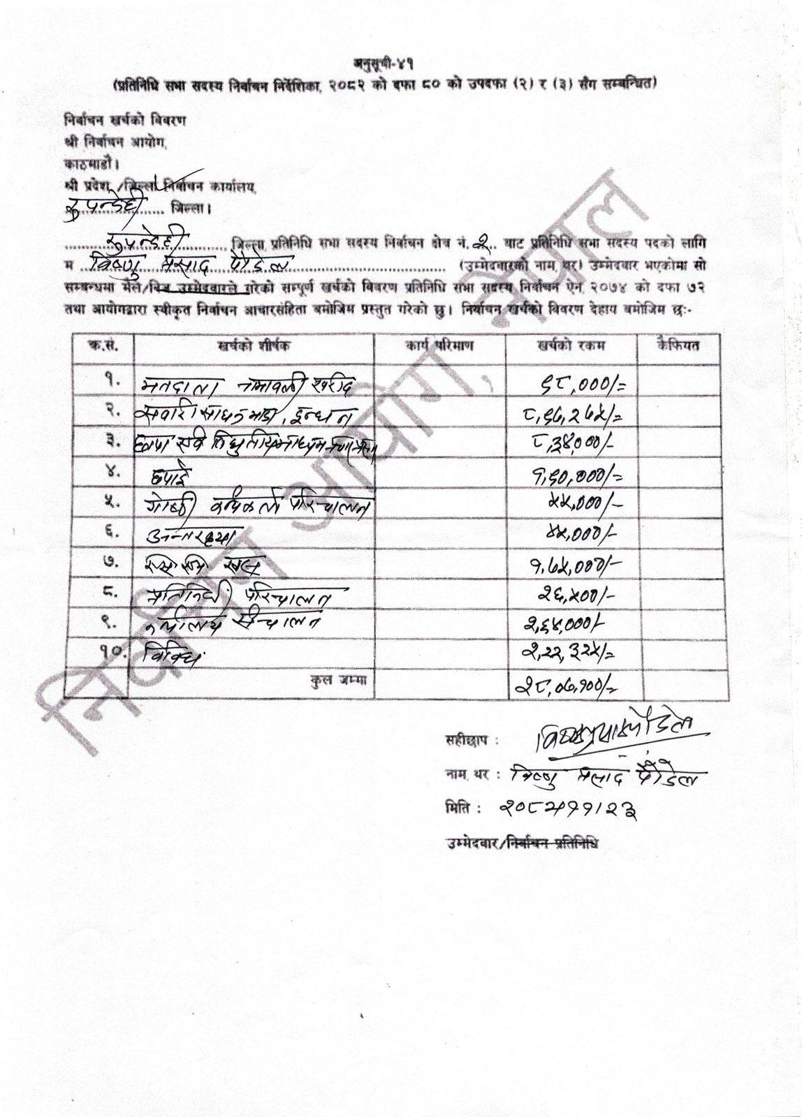 पौडेलले निर्वाचन आयोगमा पेस गरेको विवरण अनुसार फागुन २१ को चुनावमा उनले २८ लाख ७ हजार १ सय रुपैयाँ खर्च गरेका थिए ।