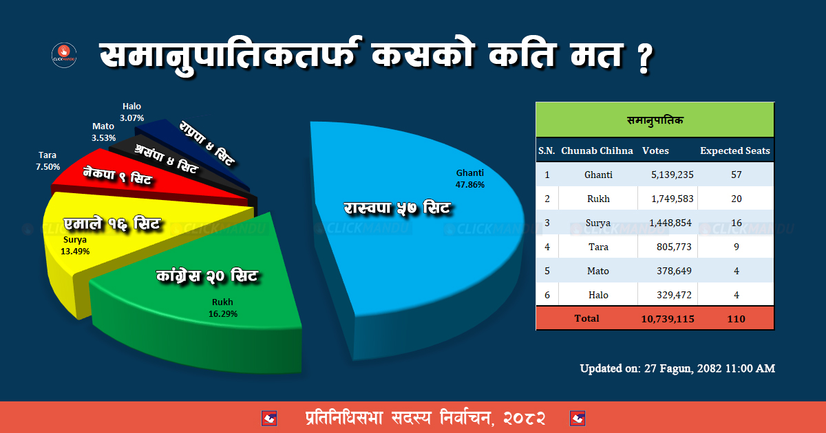 निर्वाचन आयोगले अहिलेसम्म सार्वजनिक गरेको समानुपातिक मत अनुसार रास्वपा, नेपाली कांग्रेस, नेकपा एमाले, नेपाली कम्युनिष्ट पार्टी, श्रम संस्कृति पार्टी र राप्रपाले मात्रै थ्रेसहोल्ड कटाउँदा समानुपातिक सिट यही ६ दलमा बाँडफाँट हुने देखिएको हो ।