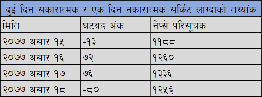 लामो समयपछि २०७७ असार १५ मा खुलेको बजारमा उक्त दिन नेप्से १३ अंकले घट्दै ११३८ बिन्दुमा कायम भयो । तर, त्यसको भोलिल्ट अर्थात् २०७७ असार १६ (२०२० जुन ३०) मा नेप्से सकारात्मक सर्किट लागेर पूरा दिन कारोबार हुन नपाउँदै बन्द भयो । यस दिन नेप्से ६ प्रतिशत अर्थात् ७२ अंकले बढेर १२६० बिन्दुमा पुग्यो ।
