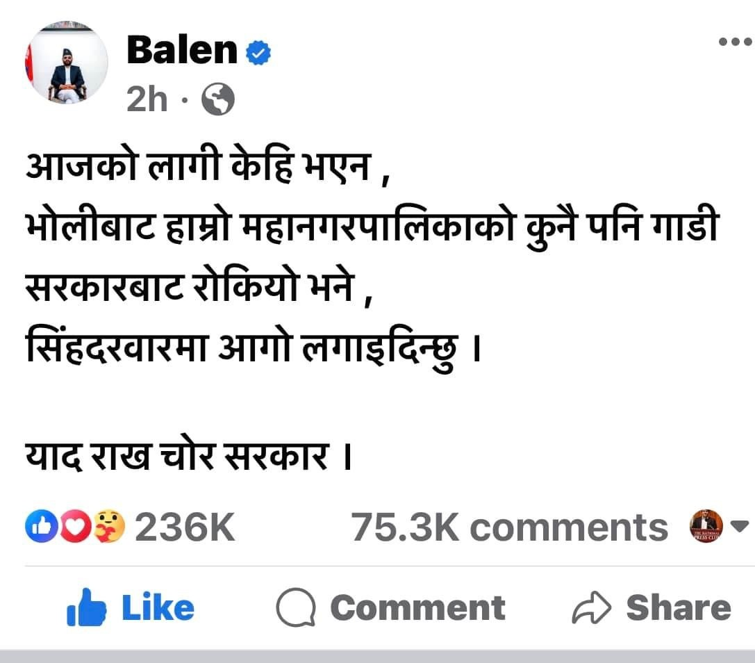 सिंहदरबार जल्नुको पछाडि एक कारक उनैलाई मानियो । प्रेगनेन्ट भएकी पत्नी सबिना काफ्ले चढेको गाडी ट्राफिक प्रहरीले कोटेश्वरमा रोकेको झोंकमा फेसबुकमा ‘सिंहदरबारमा आगो लगाइदिन्छु’ लेखेका थिए । जेनजी विद्रोहको पहिलो दिन सकिने बेला बालेनले फेसबुकमा लेखेको स्ट्याटसले पनि जनआक्रोशको आगोमा घिउ थपेको थियो । २४ गते सिंहदरबार, संसद भवन आदि जलिरहँदा बालेन नेतृत्वको महानगरले तुरून्तै दमकल नपठाएको आरोप लाग्ने गरेको छ ।
