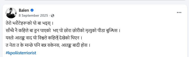 बालेनको शासनकालमा अर्को कुनै युवाले बालेनले जस्तै विकृति, विसंगति र भ्रष्टाचारविरोधी गीत गाउनु नपरोस् । सुख र समृद्धिका गीतहरू घन्किउन् । भावी प्रधानमन्त्री बालेनलाई शुभकामना !
