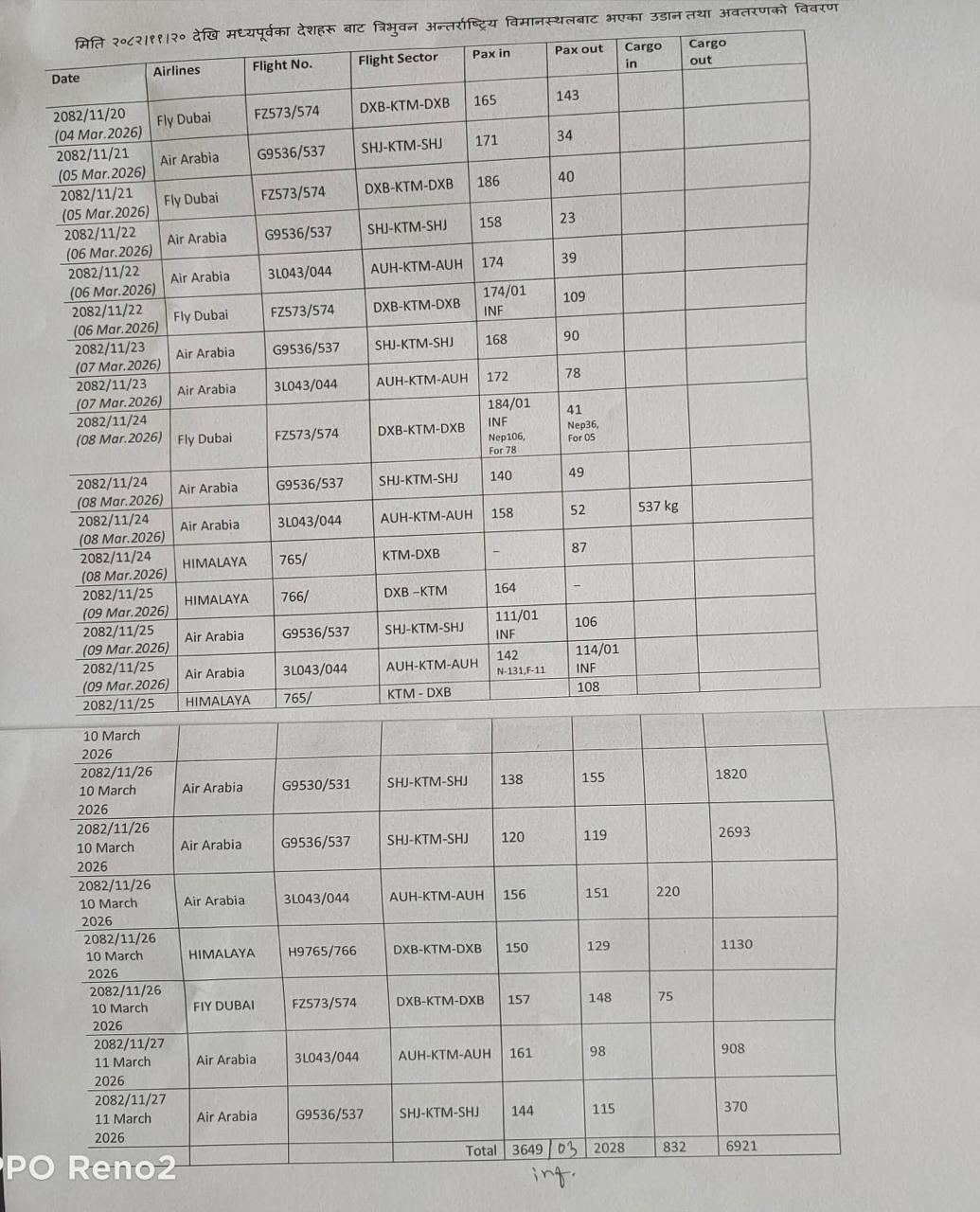 पछिल्लो १२ दिनको अवधिमा (फागुन २० देखि २७ गतेसम्म) काठमाडौं विमानस्थलबाट तीनवटा उडान भएका छन् भने २३ वटा उडान र अवतरण यूएईबाट भएको त्रिभुवन अन्तर्राष्ट्रिय विमानस्थल कार्यालयले उपलब्ध गराएको तथ्याङ्कले देखाएको छ ।