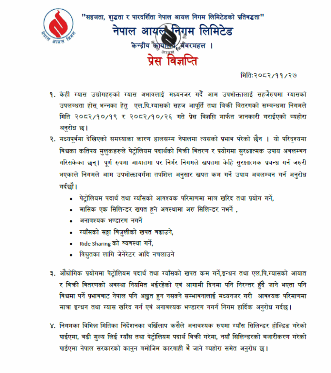 उनका अनुसार सञ्चालक समितिको बैठक आज साँझ ४ बजे बस्न लागेको छ । सम्भवत् यहि बैठकले बजारमा आधि तौल(७.१ किलो) को सिलिण्डर बजारमा पठाउने निर्णय गर्नेछ ।