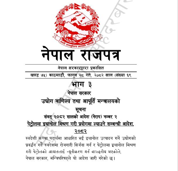 उद्योग, वाणिज्य तथा आपूर्ति मन्त्रालयले गत् शुक्रबार नेपाल राजपत्रमा ‘पेट्रोलमा इथानोल मिश्रण गरी प्रयोगमा ल्याउने सम्बन्धी आदेश, २०८२’ प्रकाशित गर्दै समिश्रणको बैद्यानिक बाटो खुला गरेको हो ।