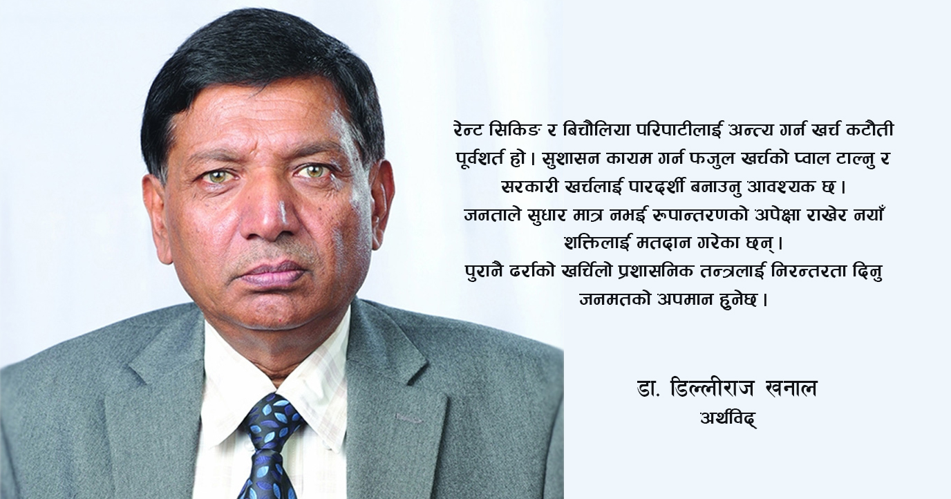 रेन्ट सिकिङ र बिचौलिया परिपाटीलाई अन्त्य गर्न खर्च कटौती एउटा पूर्वशर्त भन्दै खनालले सुशासन कायम गर्न फजुल खर्चको प्वाल टाल्नु र सरकारी खर्चलाई पारदर्शी बनाउनु आवश्यक रहेको उको भनाई छ । ‘जनताले सुधार मात्र नभई रूपान्तरणको अपेक्षा राखेर नयाँ शक्तिलाई मतदान गरेका छन् । पुरानै ढर्राको खर्चिलो प्रशासनिक तन्त्रलाई निरन्तरता दिनु जनमतको अपमान हुनेछ,’ खनालले भने ।