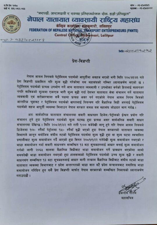 काठमाडौं । इन्धनको मूल्यवृद्धिपछि सार्वजनिक यातायात सञ्चालनमा प्रत्यक्ष असर परेको भन्दै नेपाल यातायात व्यवसायी राष्ट्रिय महासंघले भाडा समायोजन गर्न सरकारसँग माग गरेको छ।