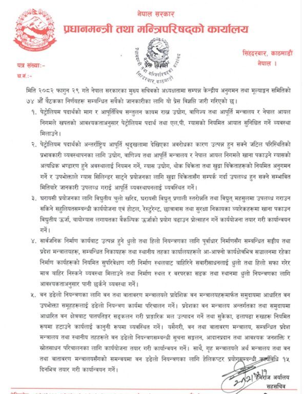 फागुन २९ गते मुख्य सचिवको अध्यक्षतामा बसेको प्रधानमन्त्री कार्यालयअन्तर्गतको केन्द्रीय अनुगमन तथा मूल्याङ्कन समितिको ७४औँ बैठकले यो विषयमा निर्णय गरी वैकल्पिक ऊर्जामा जाने निर्णय गरेको छ ।