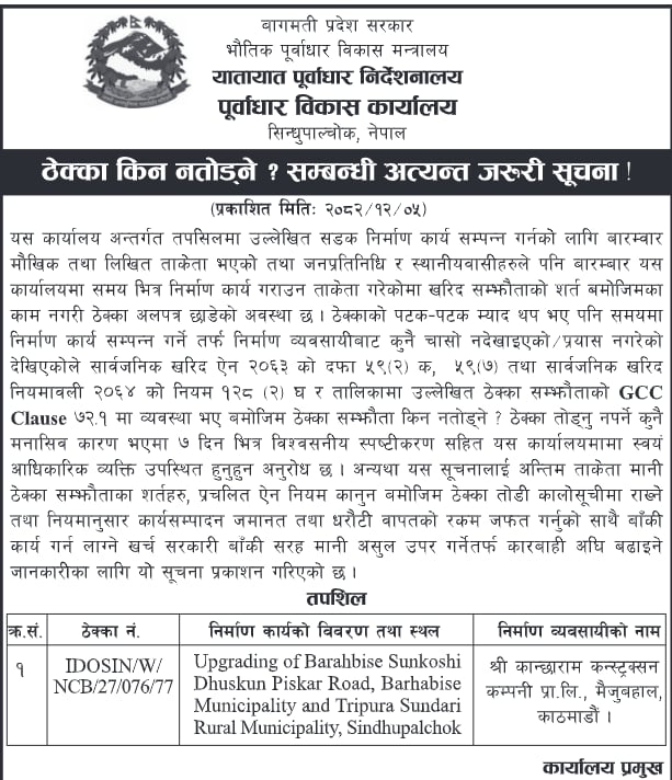 कार्यालयले सार्वजनिक गरेको विवरणअनुसार सिन्धुपाल्चोकको बाह्रबिसे नगरपालिका र त्रिपुरा सुन्दरी गाउँपालिकामा पर्ने बाह्रबिसे–धुस्कुन–पिस्कर सडक स्तरोन्नति आयोजनामा प्रगति सन्तोषजनक नभएको उल्लेख छ।