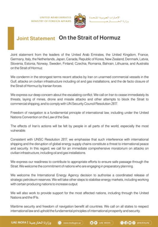 संयुक्त अरब इमिरेट्स (यूएई) को विदेश मन्त्रालयमार्फत सार्वजनिक गरिएको एक संयुक्त विज्ञप्तिमा इरानले व्यापारिक जहाज र नागरिक पूर्वाधारमाथि गरेको आक्रमणको कडा निन्दा गर्दै मार्ग सुरक्षाका लागि आवश्यक योगदान दिन तयार रहेको घोषणा गरिएको छ।