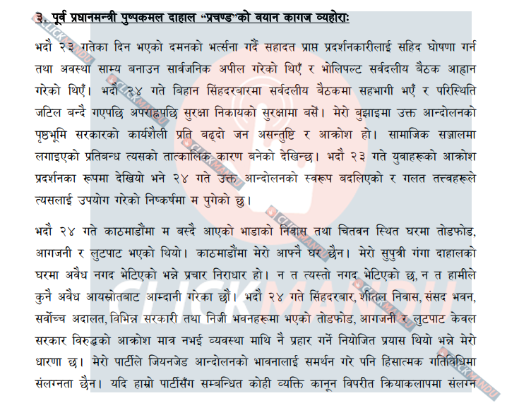 सिंहदरबार, शीतल निवास, संसद् भवन र सर्वोच्च अदालत जस्ता राज्यका मुख्य अंगहरूमा भएको आक्रमणले यो आन्दोलन केवल असन्तुष्टि मात्र नभई लोकतान्त्रिक प्रणालीलाई कमजोर बनाउने खेल भएको प्रचण्डको दाबी छ । उनले आफ्नो पार्टीले आन्दोलनको भावनालाई समर्थन गरे पनि हिंसात्मक गतिविधिमा कुनै संलग्नता नरहेको प्रष्ट पारे । ‘यदि मेरो पार्टीका कोही व्यक्ति कानुन विपरीत कार्यमा संलग्न भएको प्रमाणित भएमा उनीहरूले कानुनी कारबाही भोग्नुपर्छ भन्ने हाम्रो स्पष्ट धारणा छ,’ बयानमा प्रचण्डले भनेका छन् ।