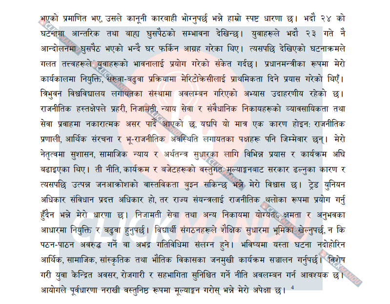 ‘भदौ २४ को घटनामा आन्तरिक तथा बाह्य घुसपैठको सम्भावना देखिन्छ। गलत तत्वहरूले युवाहरूको भावनालाई प्रयोग गरेर अराजकता मच्चाएको मेरो निष्कर्ष छ,’ उनले बयानमा भनेका छन् । सामाजिक सञ्जालमा लगाइएको प्रतिबन्धले युवाहरूमा तत्काल आक्रोश पैदा गरेको उनको विश्लेषण छ।