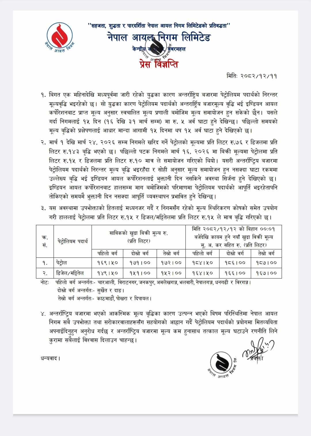 दोस्रो वर्गमा सुर्खेत र दाङ रहेका छन् भने तेस्रो वर्गमा संघीय राजधानी काठमाडौं सहित पोखरा र दिपायललाई निर्धारण गरिएको छ। निगमले जारी गरेको यो नयाँ मूल्यसूची तत्काल लागू हुने जनाइएको छ।