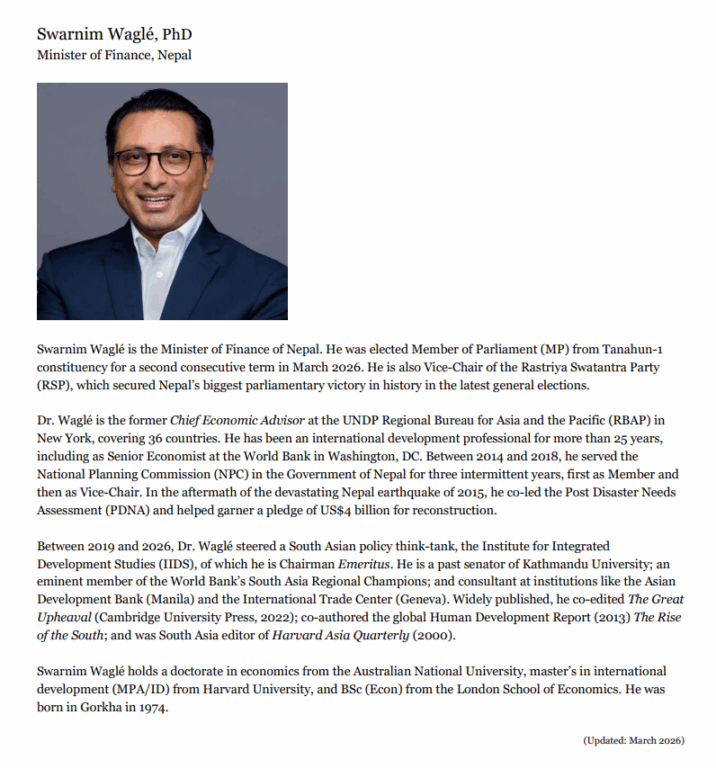 आर्थिक विकासमा सुशासनलाई पहिलो सर्त ठान्ने अर्थमन्त्री डा. स्वर्णिम वाग्ले काे हुन् ?