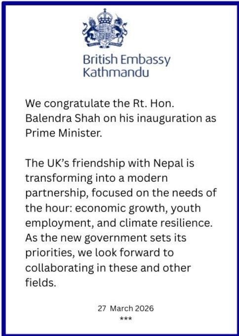 दूतावासले लेख्यो, ‘श्री बालेन्द्र शाहज्यूलाई नेपालको प्रधानमन्त्रीको रूपमा सपथ ग्रहण गर्नुभएकोमा हार्दिक बधाई । नेपालसँग बेलायतको मित्रता अहिलेको समयको आवश्यकता अनुरूप आर्थिक वृद्धि, युवा रोजगारी र जलवायु उत्थानशीलतामा केन्द्रित रहँदै एक आधुनिक साझेदारीमा रूपान्तरण भइरहेको छ । नयाँ सरकारले आफ्ना प्राथमिकताहरू निर्धारण गरिरहँदा हामी यी र अन्य क्षेत्रहरूमा सहकार्य गर्न उत्सुक छौं ।’