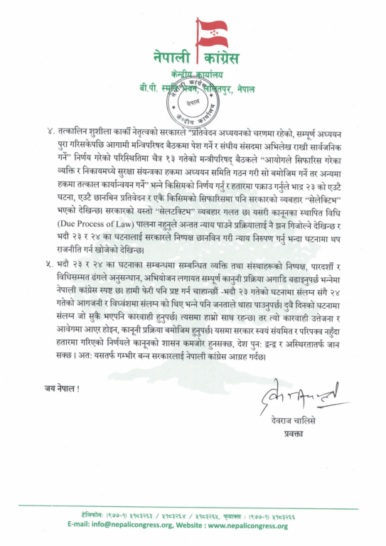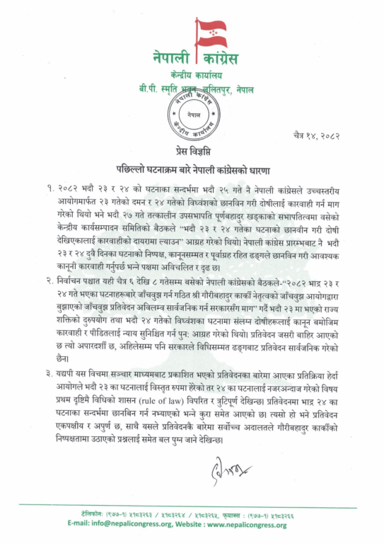 कांग्रेसले स्पष्ट रूपमा भनेको छ कि दुवै दिनका घटनामा संलग्न व्यक्ति तथा संस्थामाथि निष्पक्ष, पारदर्शी र विधिसम्मत अनुसन्धान तथा अभियोजन हुनुपर्छ।