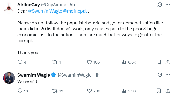 काठमाडौं । अर्थमन्त्री डा. स्वर्णिम वाग्लेले नोटबन्दी नगर्ने बताएका छन् । सामाजिक सञ्जाल ‘एक्स’मा एक प्रयोगकर्ताको सुझावमा जवाफ दिँदै वाग्लेले वर्तमान सरकार नोटबन्दीको बाटो रोज्ने पक्षमा नरहेको बताएका हुन् ।