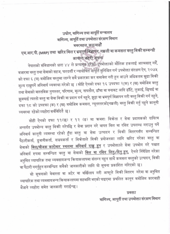 विभागले कुनै पनि वस्तुको अधिकतम खुद्रा बिक्री मूल्य (एमआरपी) तोक्दा त्यसमा लाग्ने सबै प्रकारका करहरू समावेश हुनुपर्ने अनिवार्य व्यवस्था गरेको छ । वस्तु वा सेवाको वास्तविक गुणस्तर, परिणाम, तौल र बनावटका बारेमा झुटो वा भ्रमपूर्ण विज्ञापन गरी उपभोक्तालाई झुक्याउन नपाइने विभागले प्रष्ट पारेको छ । साथै, न्यूनस्तरका, नक्कली वा कमसल वस्तु बिक्री गर्नेलाई प्रचलित कानुन बमोजिम कारबाही गरिने चेतावनी दिइएको छ।