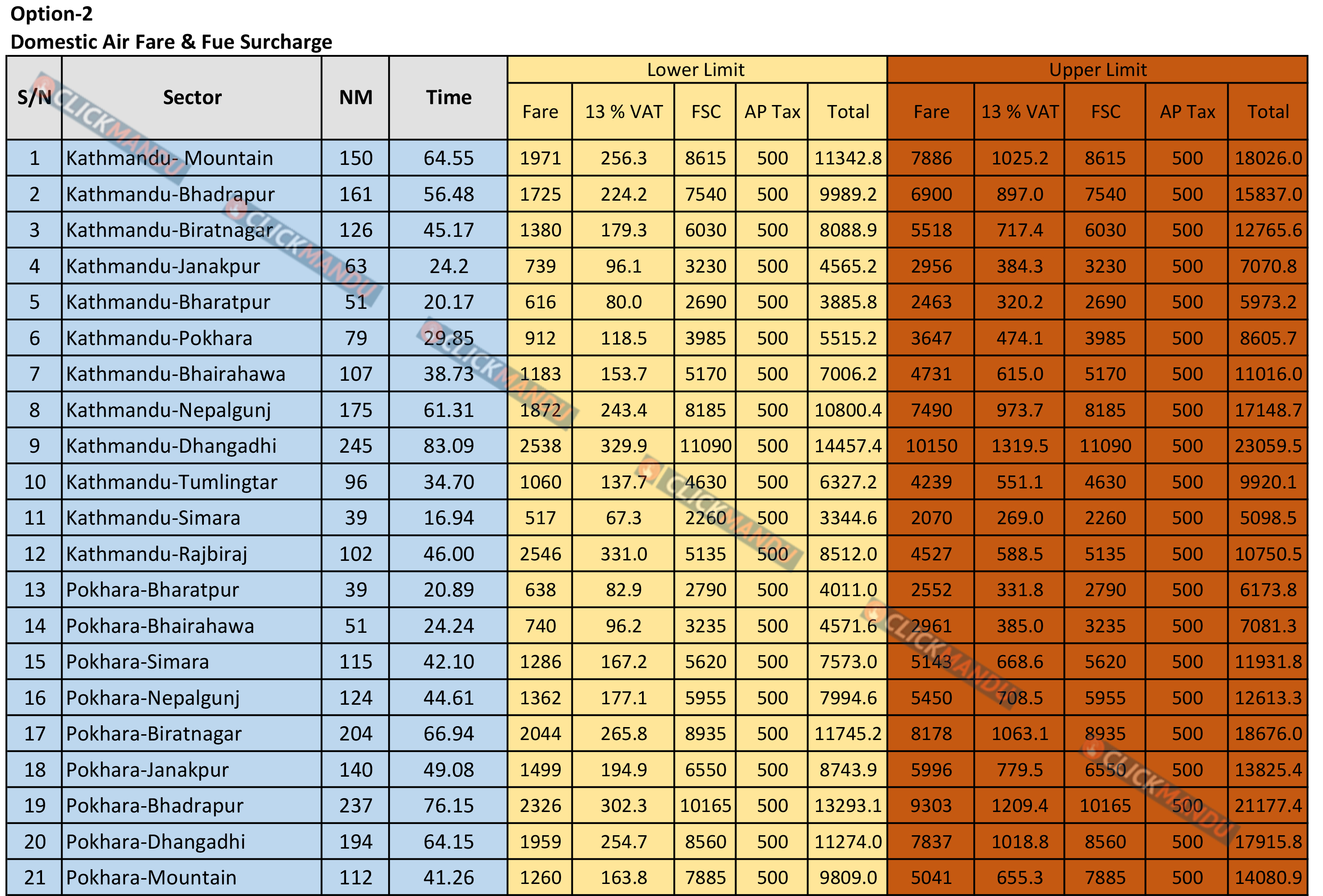 पोखरा गन्तव्यका लागि अधिकतम आधारभूत भाडा ३ हजार ६४७ रुपैयाँ लिँदा त्यसमा १३ प्रतिशत भ्याट (४७४ रुपैयाँ), इन्धन शुल्क ३ हजार ९८५ रुपैयाँ र यात्रु सेवा शुल्क ५ सय रुपैयाँ जोडिन्छ । यसरी अधिकतम भाडा दरमा टिकट काट्दा काठमाडौंबाट पोखरा जाने यात्रुले ८ हजार ६०५ रुपैयाँसम्म तिर्नुपर्छ ।