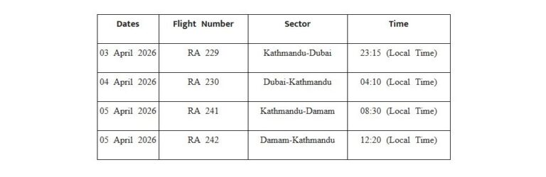 नेपाल वायुसेवा निगमले सार्वजनिक गरेको उडान तालिका अनुसार आज (अप्रिल ३) मा काठमाडौं–दुबई उडान हुनेछ। त्यस्तै, अप्रिल ४ मा दुबई–काठमाडौं र अप्रिल ५ मा काठमाडौं–दमाम–काठमाडौं उडान भर्ने तयारी गरिएको छ।