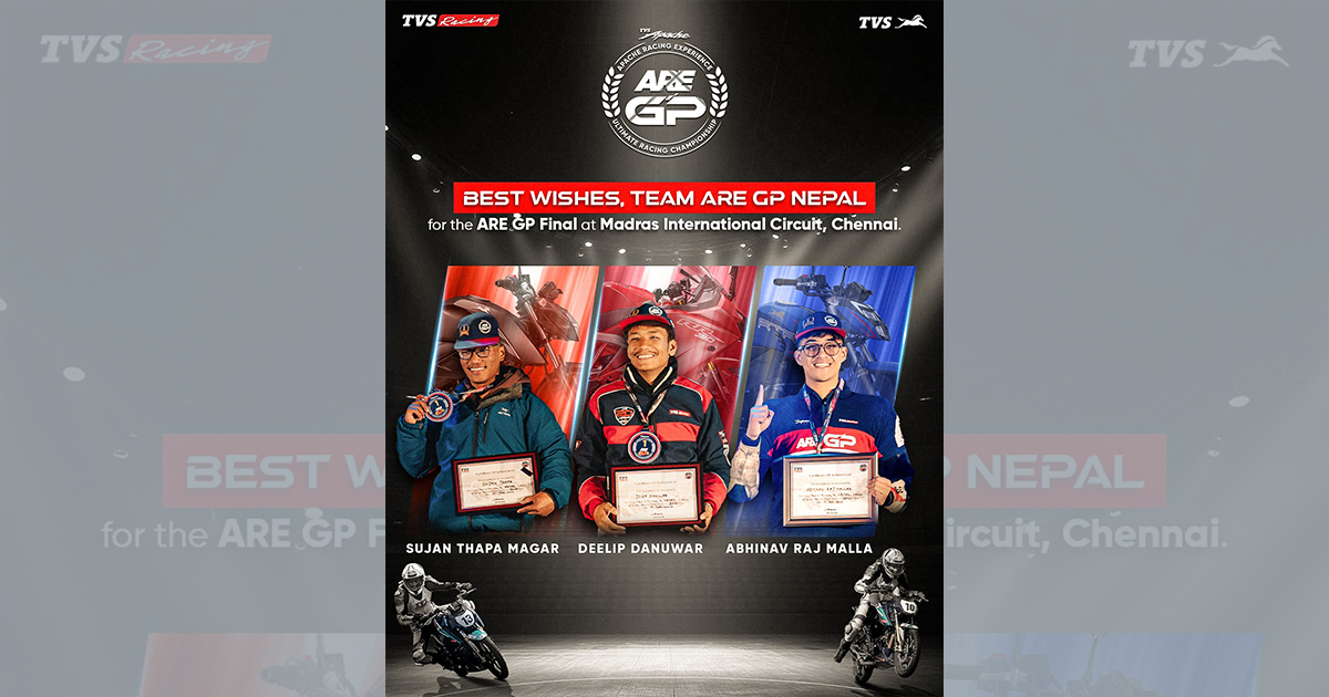 काठमाडौं । टीभीएस मोटर कम्पनीले नेपालमा आयोजना गरेको ‘एआरई जीपी’मा उत्कृष्ट प्रदर्शन गर्ने तीन नेपाली राइडरहरू अन्तर्राष्ट्रिय फाइनलका लागि छनोट भएका छन् । छनोट भएका ती राइडरहरू भारतको चेन्नईस्थित ‘मद्रास इन्टरनेसनल सर्किट’मा हुने प्रतिस्पर्धाका लागि प्रस्थान गरेका छन् ।
