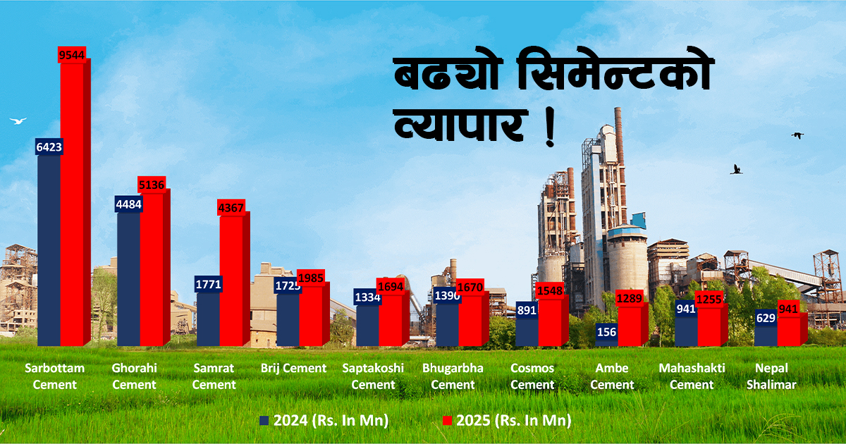 काठमाडौं । गत आर्थिक वर्षमा बजारमा सिमेन्टको माग बढ्दा देशभरका १० वटा कम्पनीको व्यापार समग्रमा ४९ प्रतिशतले बढेको छ । १० कम्पनीको व्यापार सन् २०२४ को तुलनामा सन् २०२५ मा ४९ प्रतिशतले बढेको पाइएको हो ।