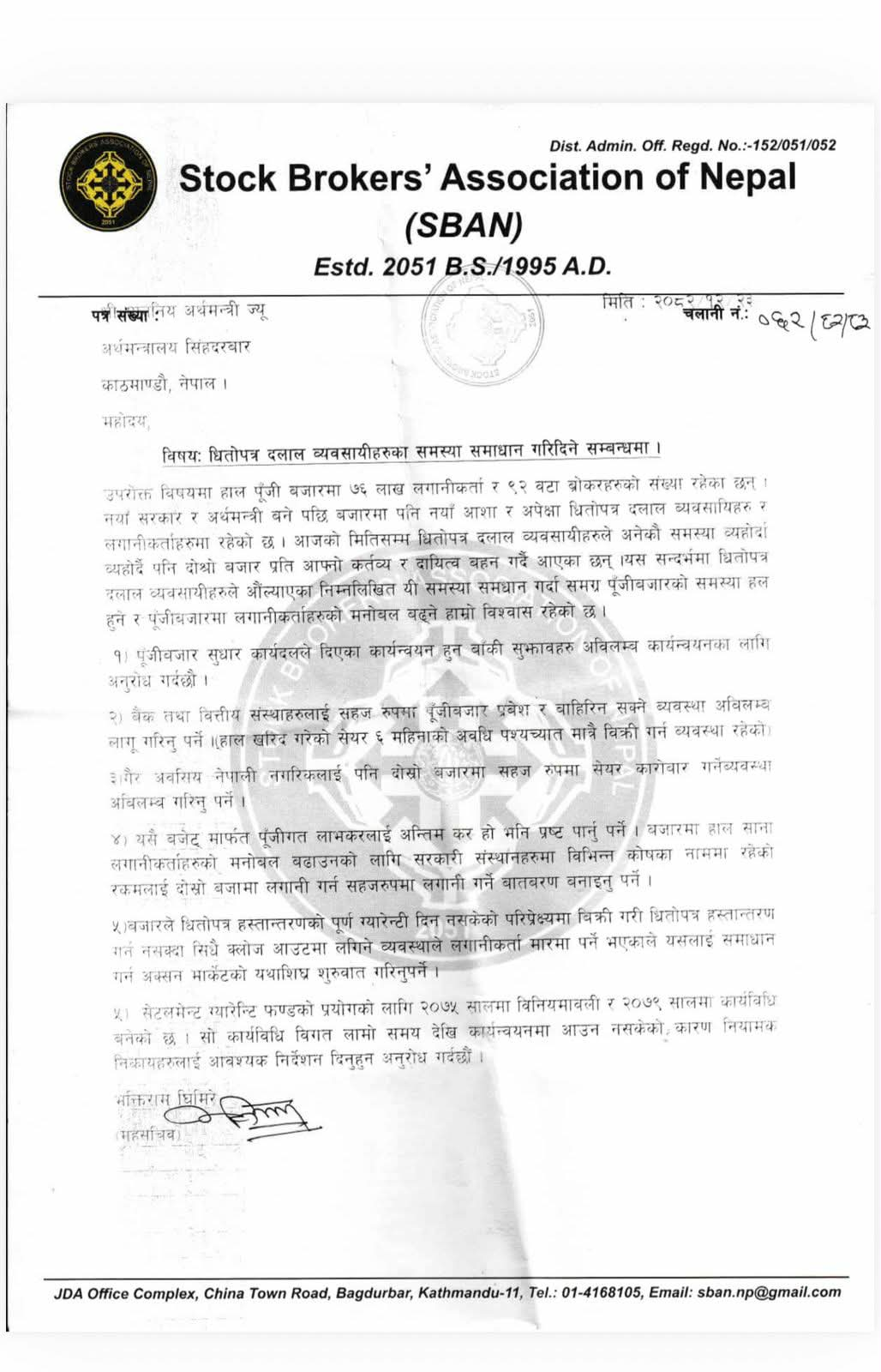 एशोसिएसनको तर्फबाट पुँजीबजार सुधार कार्यदलले दिएका कार्यन्वयन हुन बाँकी सुझावहरु अविलम्ब कार्यन्वयन गर्न, बैंक तथा वित्तीय संस्थाहरुलाई सहज रुपमा पुँजीबजार प्रवेश र बाहिरिन सक्ने व्यवस्था अविलम्ब लागू गर्न माग गरेका छन् ।