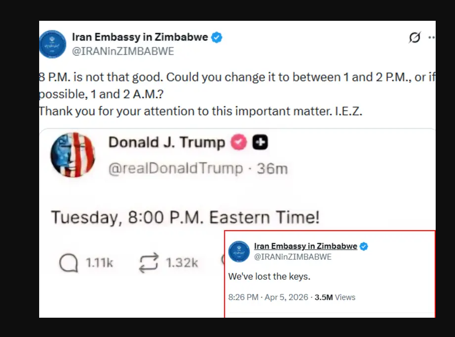 एजेन्सी । जिम्बाब्वेस्थित इरानी दूतावासले अमेरिकाका राष्ट्रपति डोनल्ड ट्रम्पको त्रास फैलाउने रणनीति र पोस्टहरूको व्यंग्यात्मक टिप्पणीमार्फत जवाफ दिइरहेको छ ।