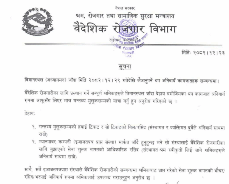 काठमाडौं । वैदेशिक रोजगार विभागले विदेश जाने श्रमिकका लागि थप कागजात अनिवार्य गरेको छ ।
