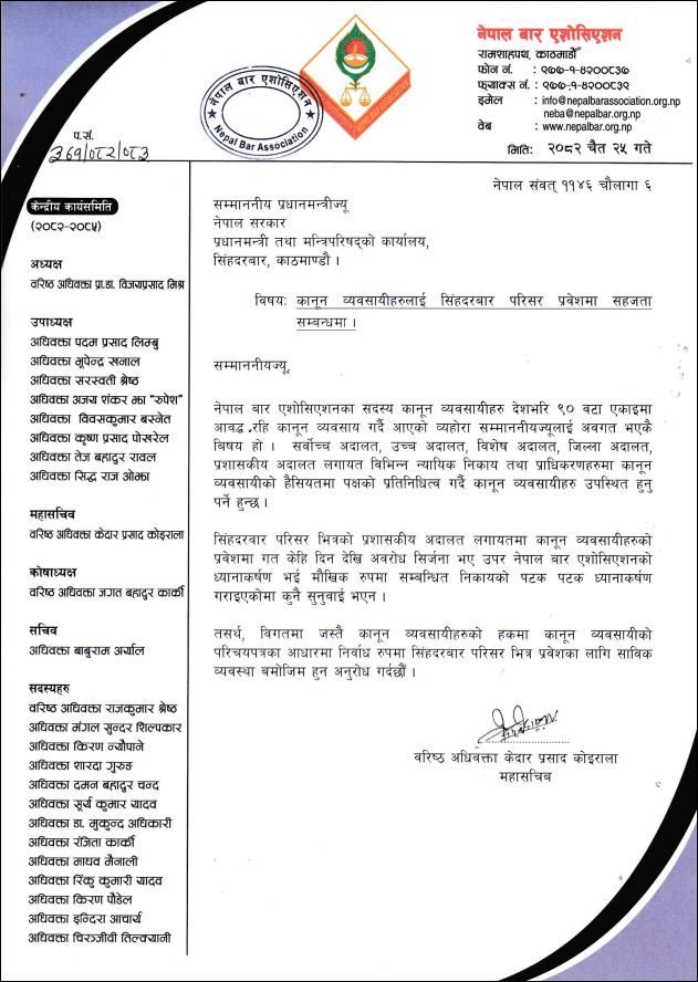 परिचय पत्रकै आधारमा सिंहदरबार प्रवेशको व्यवस्था मिलाइदिन प्रधानमन्त्री बालेनलाई बारको आग्रह