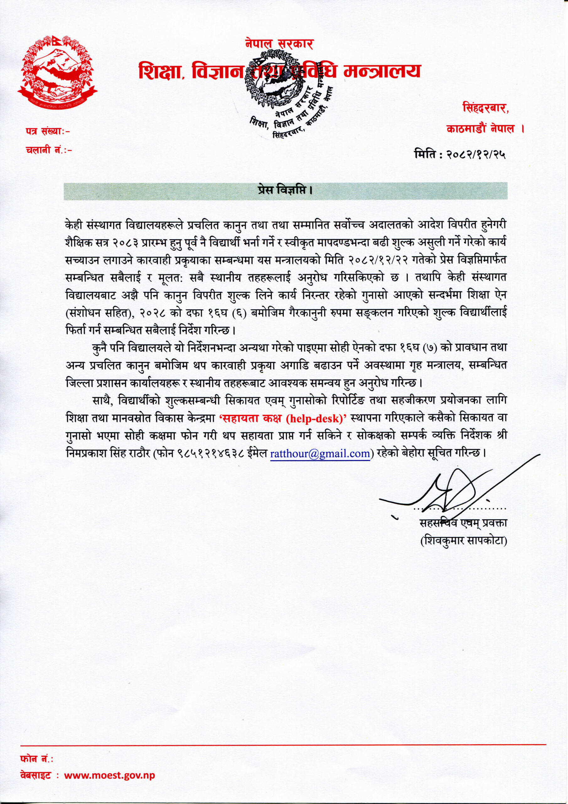 साथै, विद्यार्थीको शुल्कासम्बन्धी सिकायत एवम् गुनासोको रिपोर्टिं तथा सहजीकरण प्रयोजनका लागि शिक्षा तथा मानवस्रोत विकास केन्द्रमा सहायता कक्ष (हेल्प डेस्क) स्थापना गरिएको मन्त्रालयले जनाएको छ । कसैको सिकायत वा गुनासो भएमा सोही कक्षमा फोन गरी थप साथै, विद्यार्थीको शुल्कासम्बन्धी सिकायत एवम् गुनासोको रिपोर्टिं तथा सहजीकरणसहायता प्राप्त गर्न सकिने र सोकक्षको सम्पर्क व्यक्ति केन्द्रका निर्देशक निमप्रकाश सिंह राठौर (फोनः९८५१२१४६३८) सम्पर्क गर्न सकिने मन्त्रालयले विज्ञप्तिमा उल्लेख गरेको छ ।
