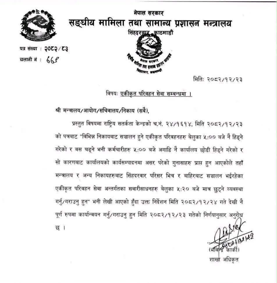 संघीय मामिला तथा सामान्य प्रशासन मन्त्रालयले एक सूचना जारी गर्दै अबदेखि सिंहदरबार परिसरभित्र र बाहिरबाट सञ्चालन हुने कर्मचारी ओसार्ने सवारीसाधनहरू बेलुका ५:२० बजे मात्र छुट्ने व्यवस्था गरेको हो । यसअघि यस्ता बसहरू ठिक ५:०० बजे छुट्ने गर्दथे ।