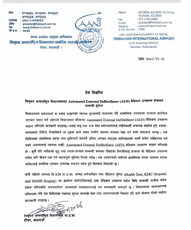काठमाडौं। त्रिभुवन अन्तर्राष्ट्रिय विमानस्थलले हवाई यात्रु तथा विमानस्थल प्रयोगकर्ताहरूको स्वास्थ्य सुरक्षालाई ध्यानमा राख्दै आकस्मिक अवस्थामा तत्काल प्राथमिक उपचार प्रदान गर्ने उद्देश्यले अटोमेटेड एक्स्टर्नल डिफिब्रिलेटर (एईडी) नामक आधुनिक मेडिकल उपकरण जडान गरेको छ।
