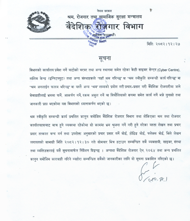 काठमाडौं । वैदेशिक रोजगार विभागले आफ्नो कार्यालय आसपास सञ्चालित साइबर र तालिम केन्द्रहरूलाई भ्रमपूर्ण प्रचारप्रसार रोक्न कडा निर्देशन जारी गरेको छ ।