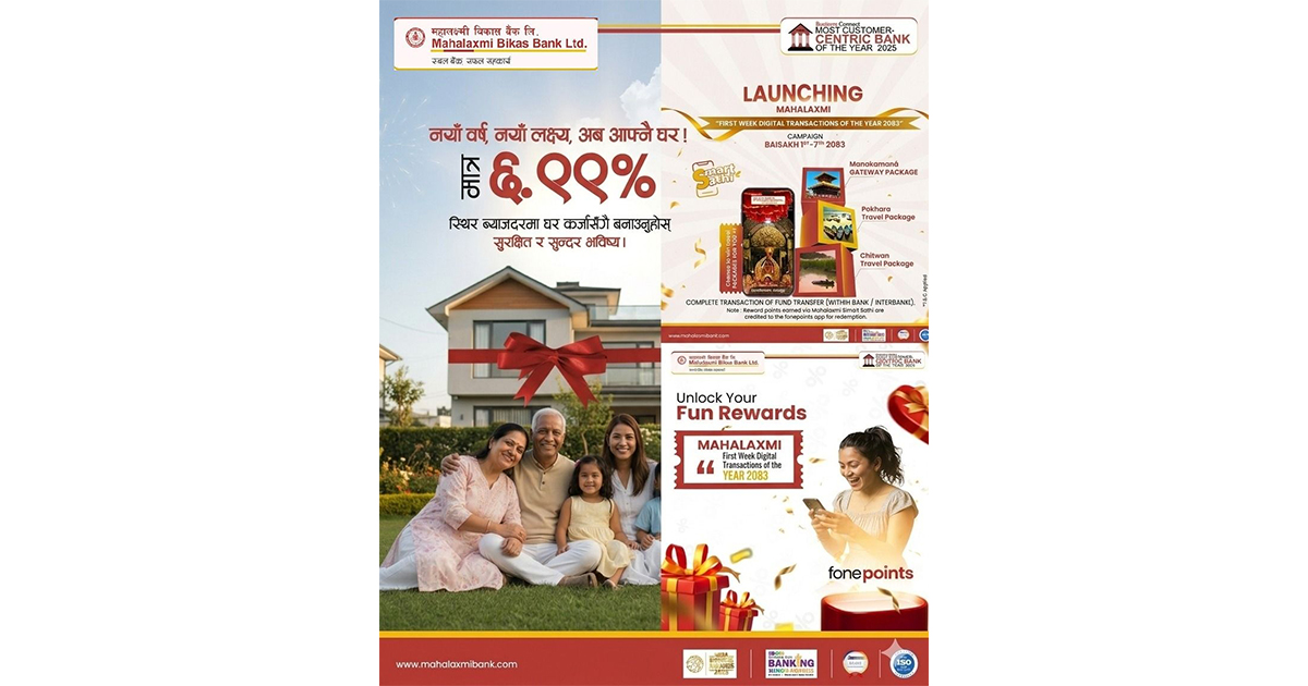 नयाँ वर्ष २०८३ का लागि महालक्ष्मी विकास बैंकको विशेष योजना: भ्रमण प्याकेजदेखि सुलभ घरकर्जासम्म