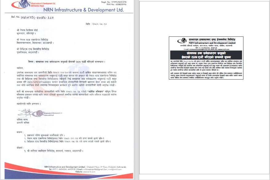 योसँगै कम्पनीको दुईवटा आईजिन एउटैमा रुपान्तरण भयो र संस्थापक सेयरधनीले पनि सर्वसाधारण सरह ‘एनआरएन’ सिम्बोलबाटै दोस्रो बजारमा आफ्नो सेयर कारोबार गर्न सक्ने अवस्था बन्यो । हाल पनि निजी क्षेत्रका कम्पनीहरुलाई दोहोरो आईजिन दिँदा पनि एनआरएनले पूरा गरेको प्रक्रिया नै गरेर जान सक्ने विषय उठिरहेको छ ।