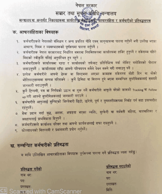 काठमाडौं । सञ्चार मन्त्रालयको काम एकै दिनमा टुंग्याउनुपर्ने गरी कर्मचारीको लागि आचारसंहिता जारी भएको छ । कर्मचारीको लागि सञ्चार मन्त्रालयले जारी गरेको ९ बुँदे आचारसंहितामा दैनिक कार्यसम्पादनमा देखिँदै आएको ढिलाइ अन्त्य गर्दै सेवा प्रवाहलाई तीव्र र प्रभावकारी बनाउन खोजिएको उल्लेख छ ।