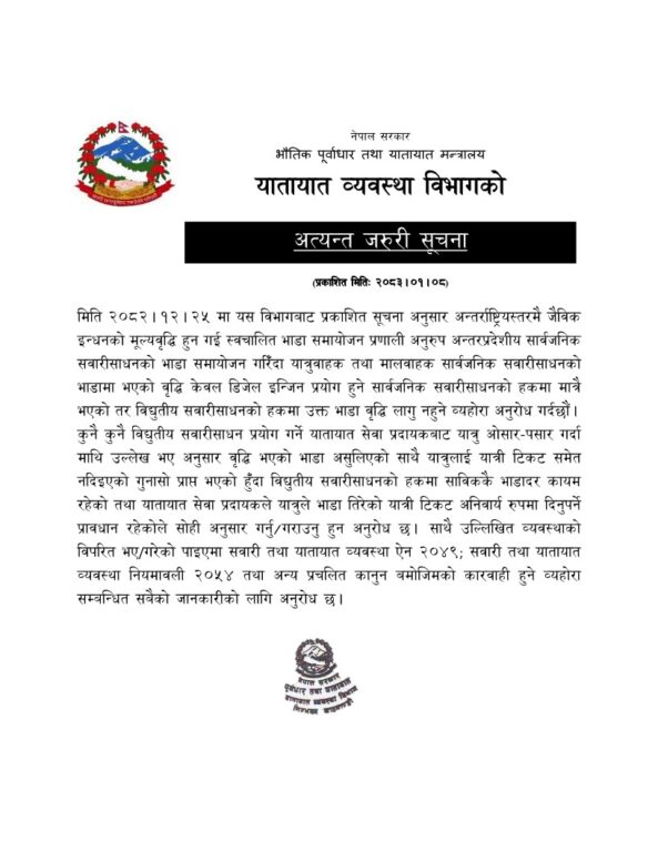विभागले ‘अत्यन्त जरुरी सूचना’ जारी गर्दै हालै गरिएको भाडा समायोजन केवल डिजेल इन्जिन भएका सार्वजनिक सवारी साधनका लागि मात्र भएको जानकारी दिएको हो।