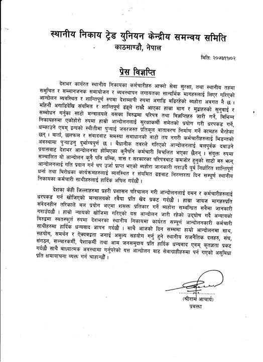 स्थानीय निकायमा कार्यरत कर्मचारीले देशभरका सेवा ठप्प बनाएको कारण सबै नेपाली प्रभाबित भएका हुन् । स्थानीय निकायमा कार्यरत कर्मचारीले गत २ फागुनदेखि सबै स्थानीय निकायको काम ठप्प पारेर आन्दोलन गरिरहेका छन् ।
