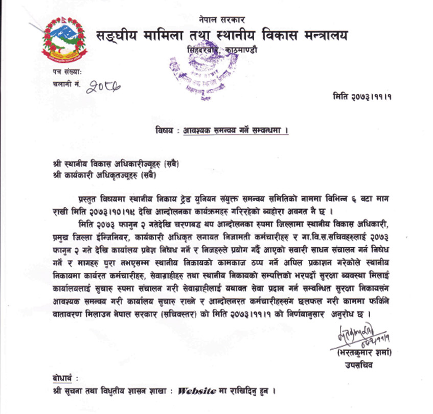 फागुन २ गतेदेखि स्थानीय निकायका कर्मचारीको आन्दोलनका कारण सेवा प्रवाह ठप्प छ । सार्बजनिक सेवा प्रवाह रोकिएका कारण कर्मचारीसँग वार्ता गरेर समस्या समाधान गर्ने प्रयत्न गरिएको भएपनि कर्मचारी वार्तामै आउन नचाहेकोले सम्भब नभएको संघीय मामिला तथा स्थानीय बिकास मन्त्रालयका सहचिब चक्रबहादुर बुढाले जानकारी दिए ।