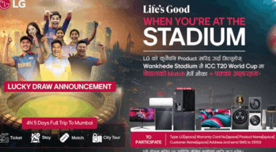 काठमाडौं । एलजी नेपालले वानखेड़े स्टेडियममा नेपाल टोलीको खेल प्रत्यक्ष हेर्न टि(२० विश्वकप यात्राको पहिलो