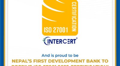 काठमाडौं । ज्योति विकास बैंकले सूचना सुरक्षा व्यवस्थापन प्रणालीमा अन्तर्राष्ट्रिय मान्यता प्राप्त आईएसओ २७००१:२०२२ प्रमाणपत्र